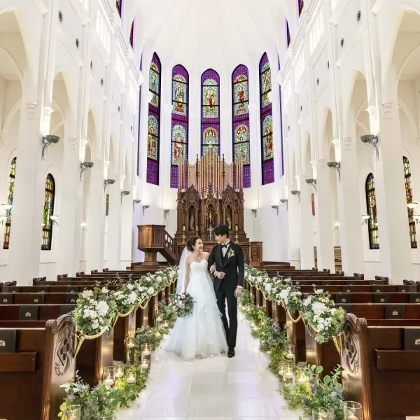 20mのバージンロードや高さ8mのステンドグラスが荘厳な煌めきをはなち、花嫁憧れの世界が広がります。また、イギリス製パイプオルガンが奏でる優しく崇高な音色は誰もが心を奪われます。